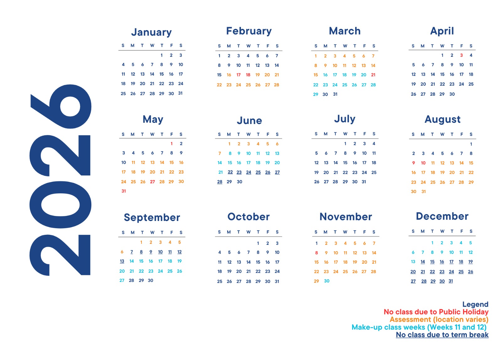 For a quick overview, refer to the event calendar below, which highlights all term periods for 2026. Assessment weeks are also indicated on each term page.
